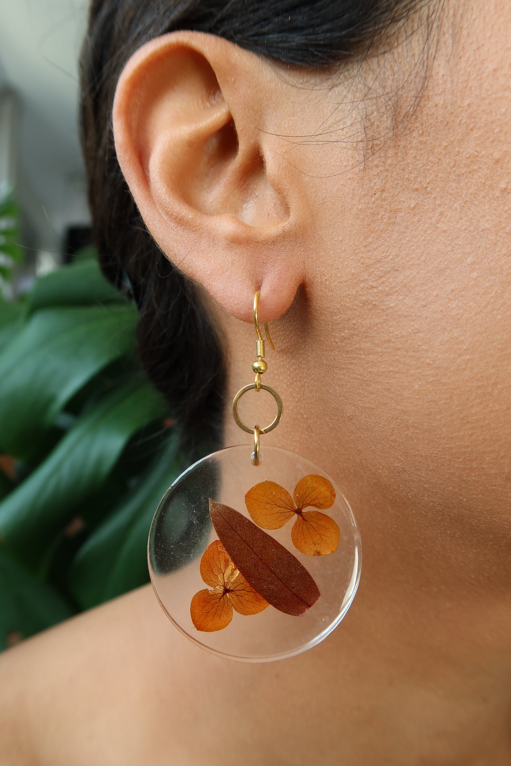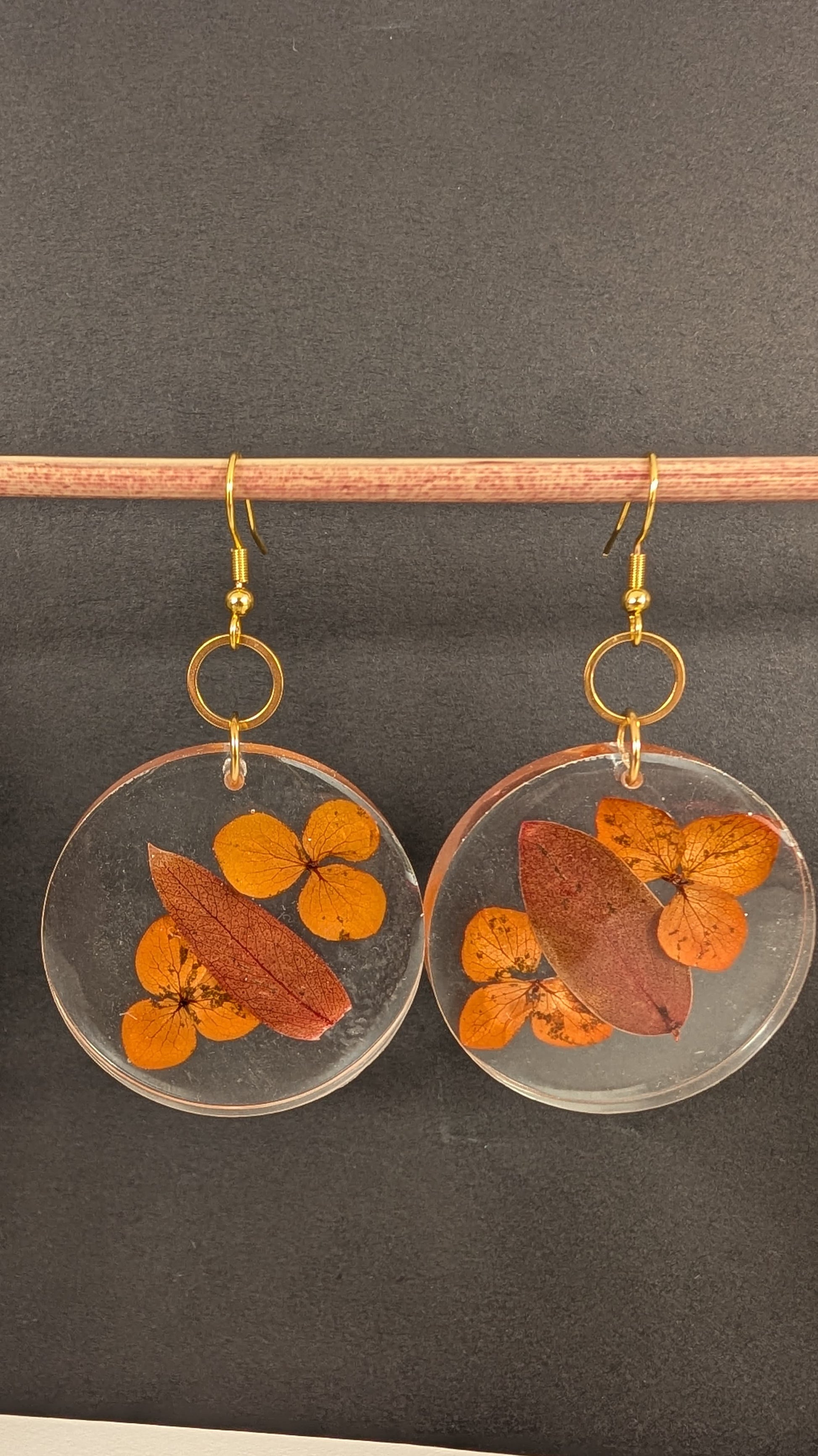 - Boucles d'oreille artisanales en résine époxy transparente agrémentées de véritables fleurs séchées.