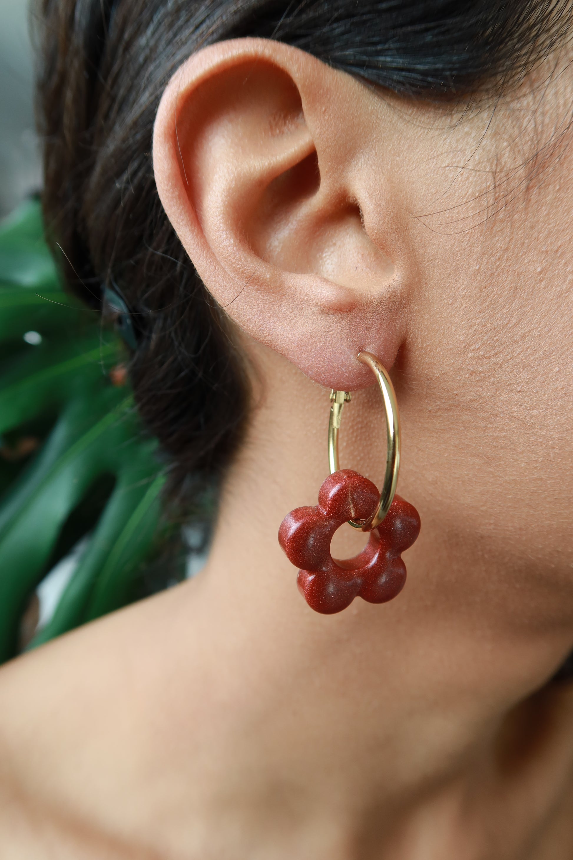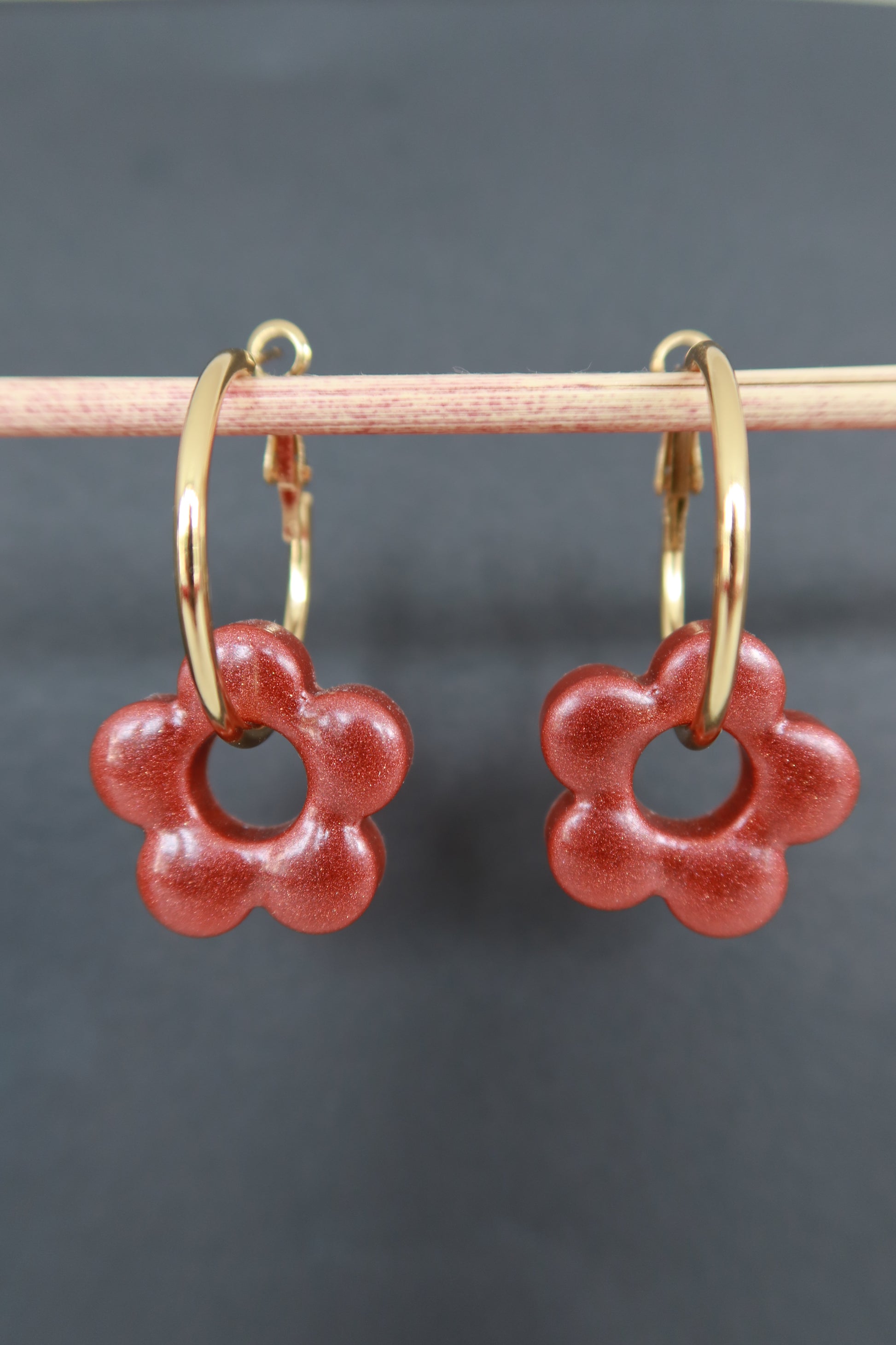 - Boucles d'oreille artisanales en résine époxy aux teintes rouges.