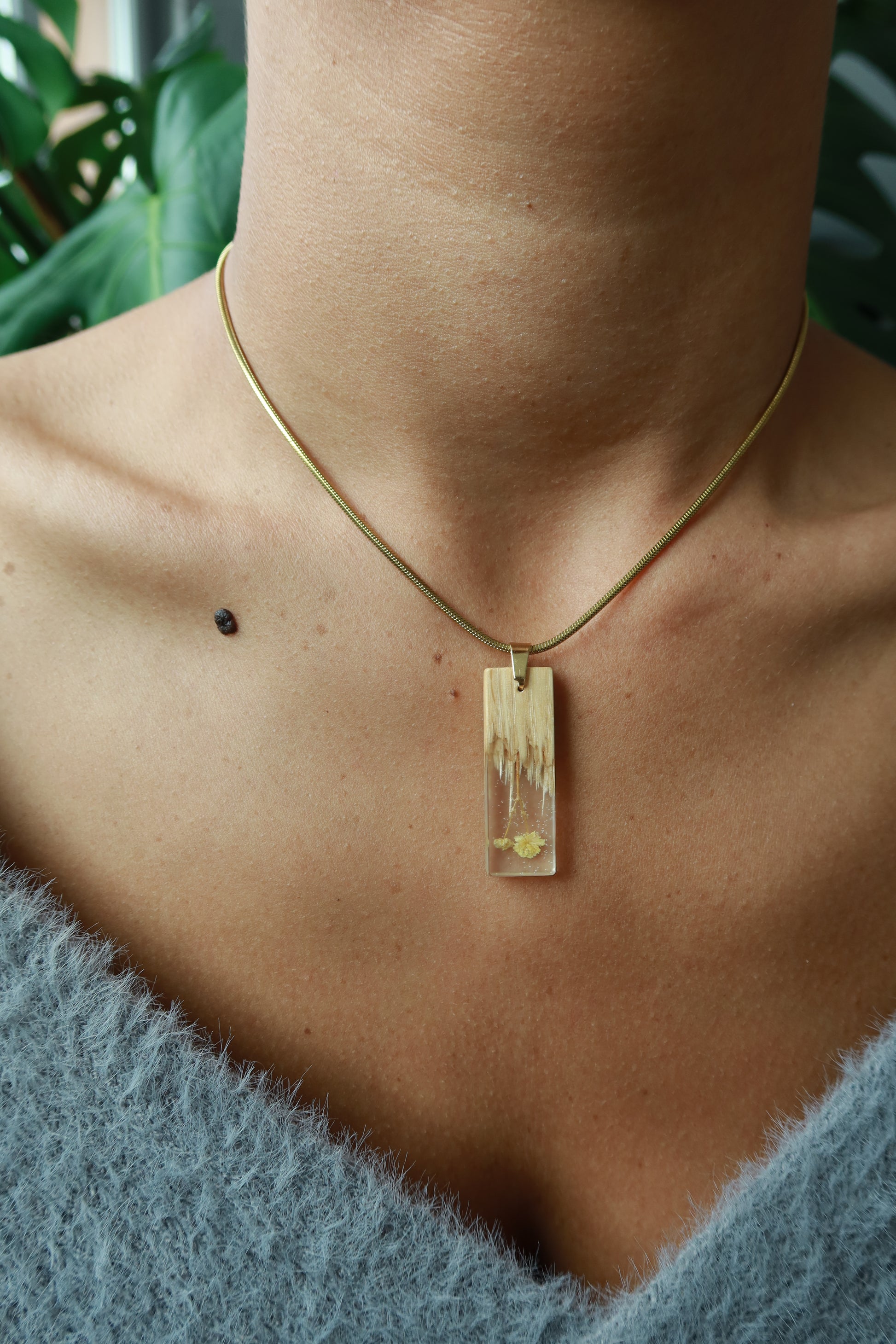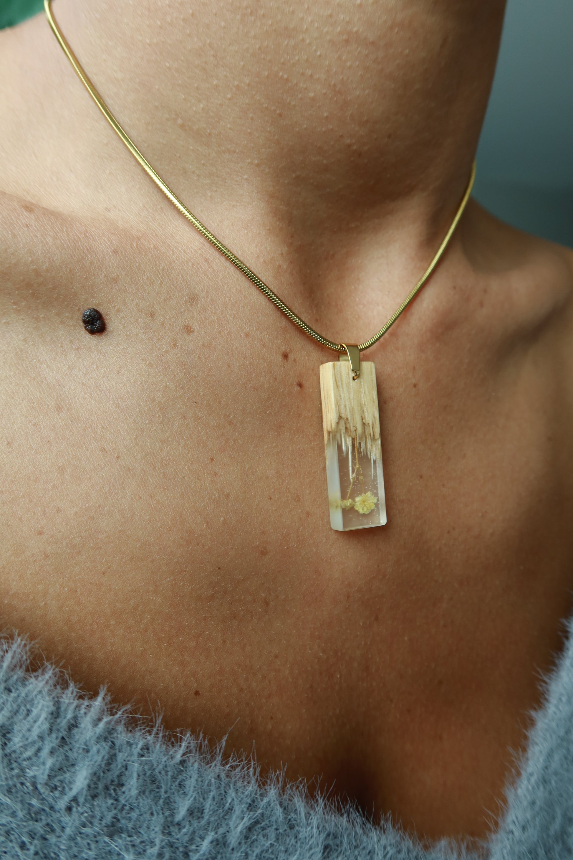 - Création artisanale conjuguant bois naturel et résine époxy transparente agrémenté d'une fleur pour un rendu sophistiqué et organique.