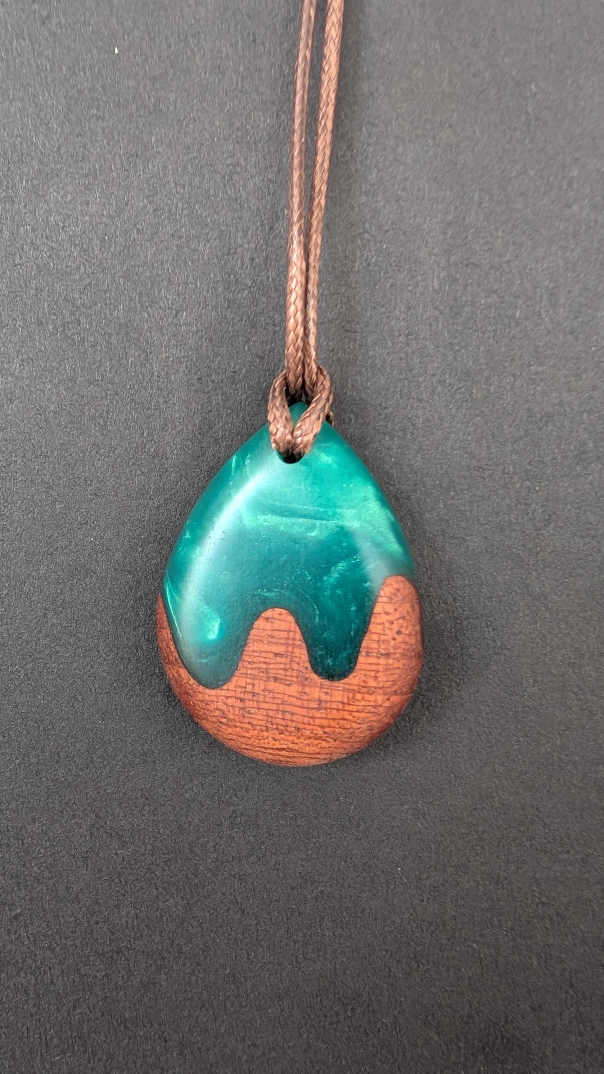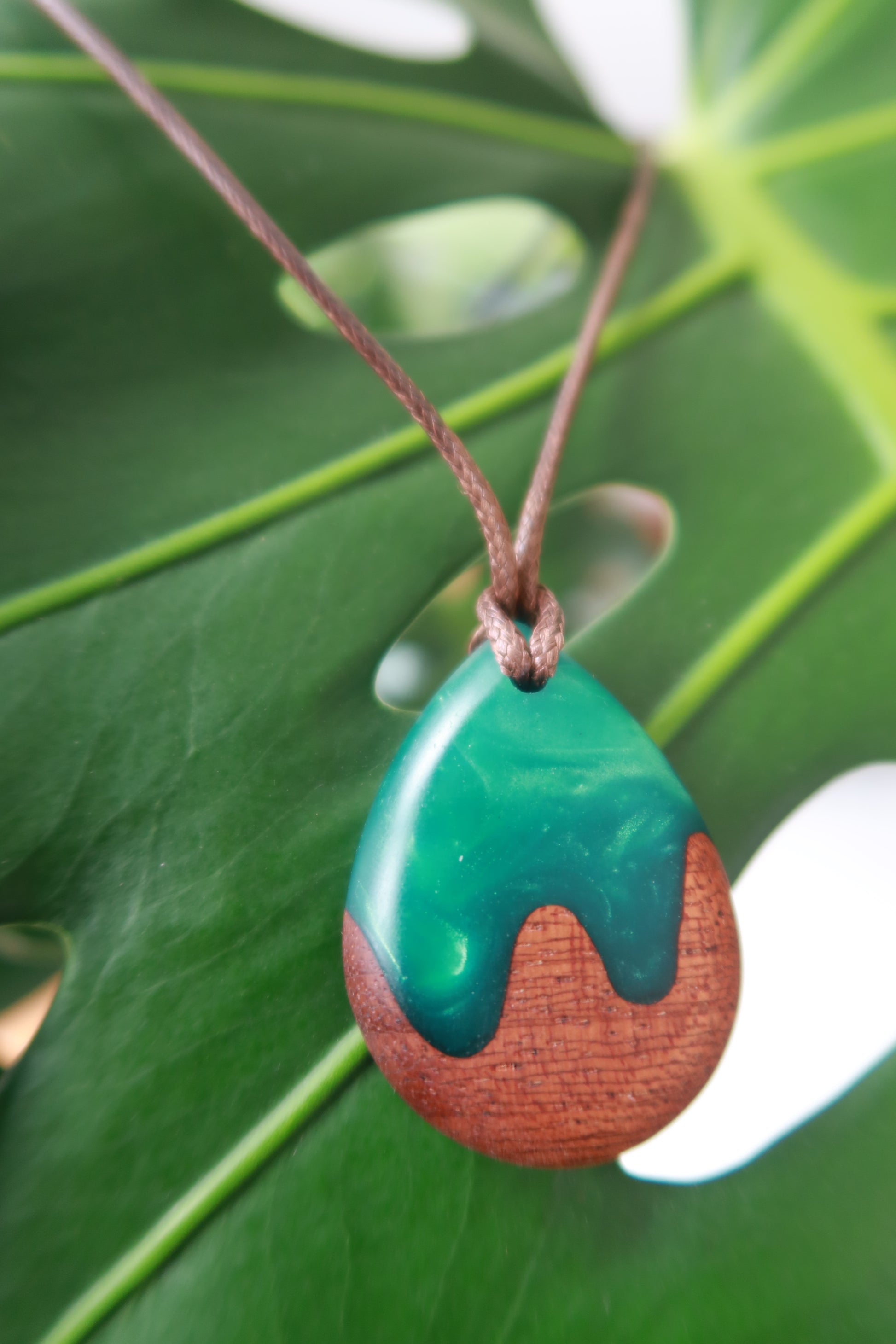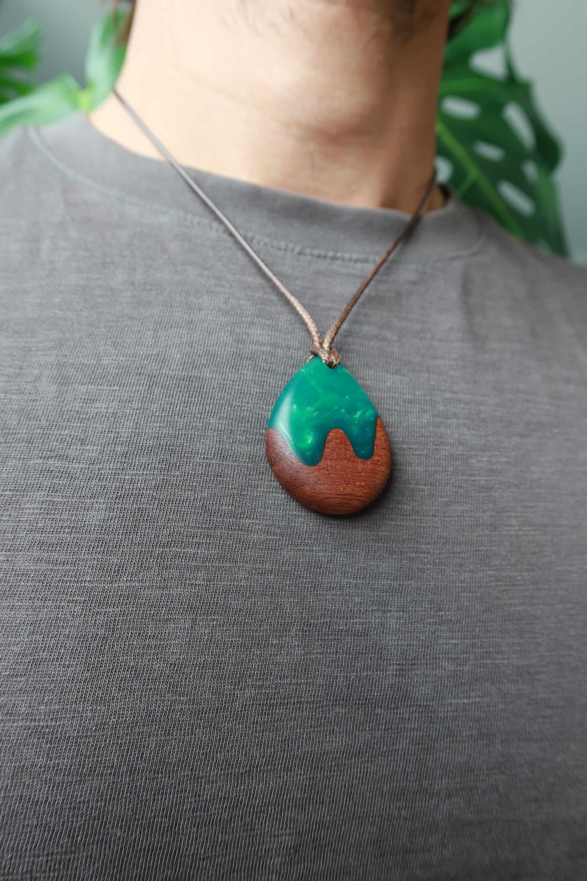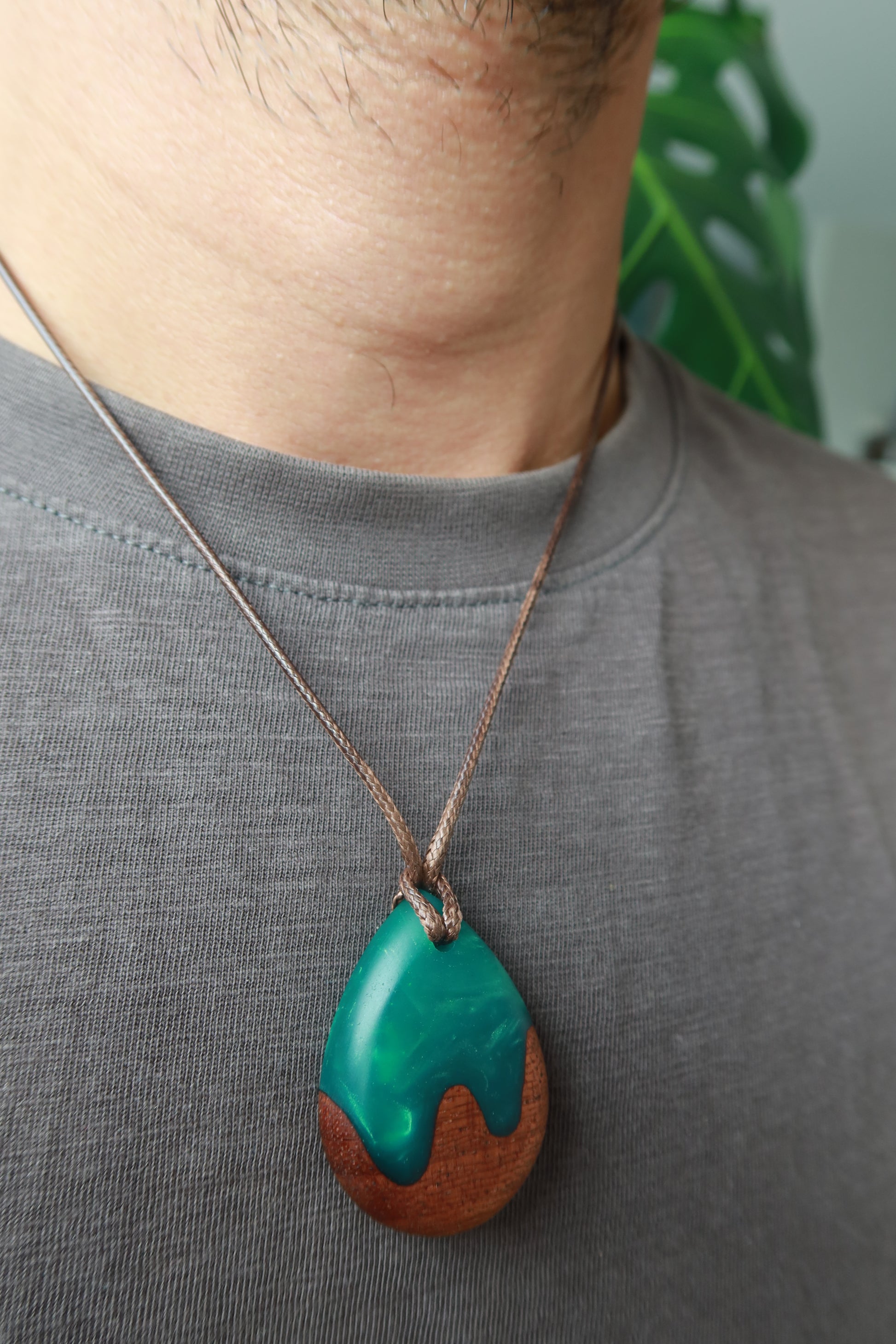 - Chaque pièce est façonnée à la main, garantissant l'unicité de son design. Le pendentif combine la chaleur du bois avec l'éclat de la résine, créant un contraste visuel remarquable.